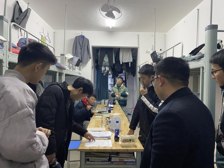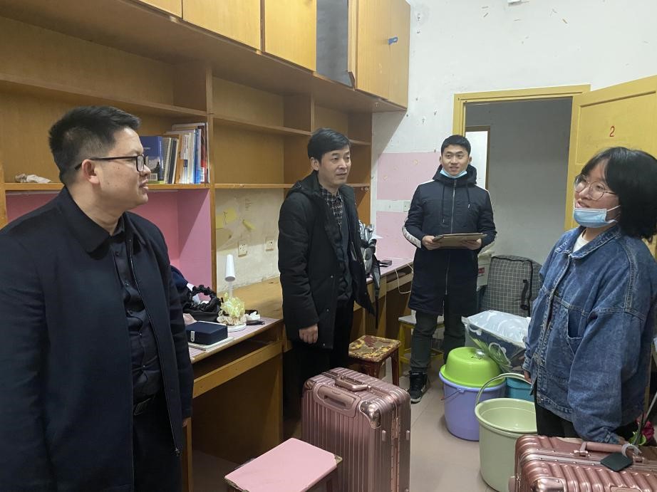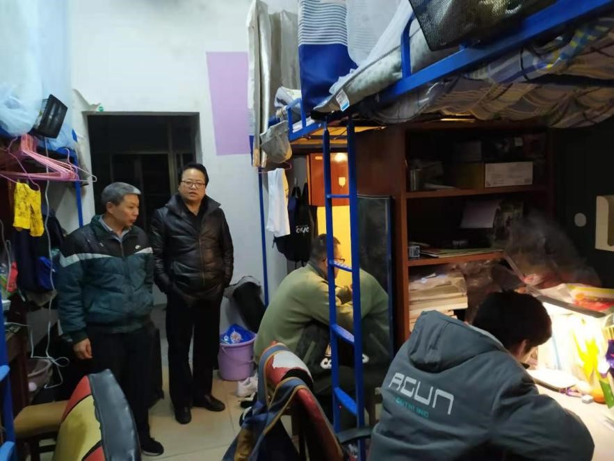 杨龙斌一行来到寝室,详细了解同学们新学期到校、课程等情况。段武城与同学们交流新学期的学习计划,要求大家专注于学业,提高自身专业水平,并叮嘱同学们天气还比较冷,要注意保暖。公司辅导员对楼内的设施进行了细致地询问和了解,对员工进行亲切地问候,对新生入学报到过程是否顺利、是否辛苦表示关心,交流氛围轻松惬意。